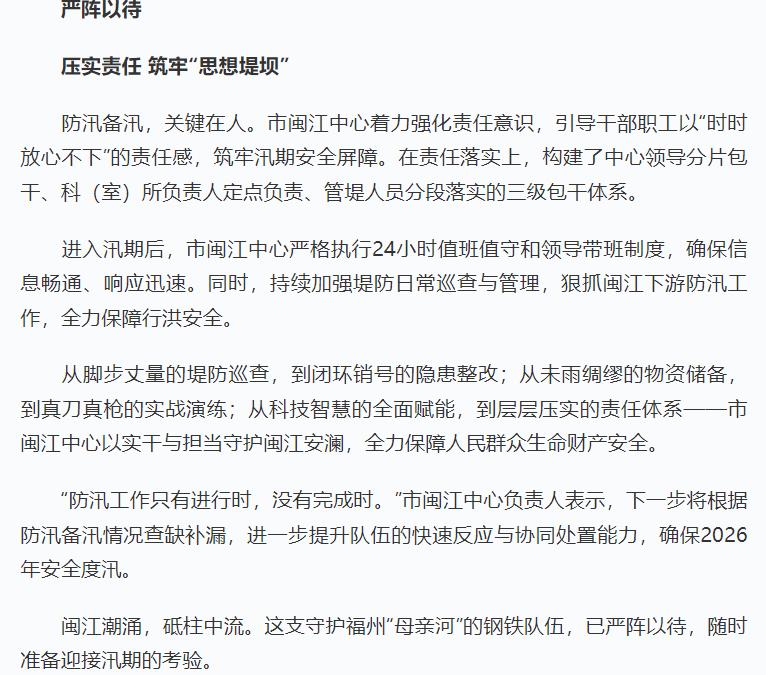坚守一线护堤防 筑牢闽江安澜屏——福州市闽江下游河道管护中心抓实抓细2026年防汛备汛各项措施