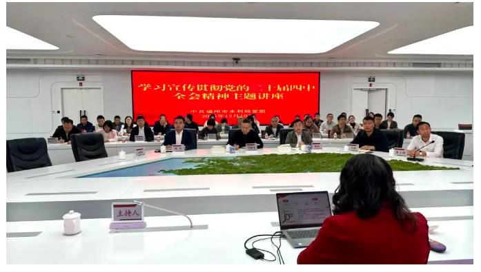 为深入学习领会、全面准确把握党的二十届四中全会的重大意义、核心要义和实践要求,引导全局党员干部职工切实把思想和行动统一到党中央决策部署及省、市委工作要求上来,12月10日,福州市水利局举办学习宣传贯彻党的二十届四中全会精神主题讲座。市水利局党组书记、一级调研员刘毅宙主持。市水利局局长张帆、局领导、局机关全体工作人员、局属单位副科级以上领导干部等参加讲座。