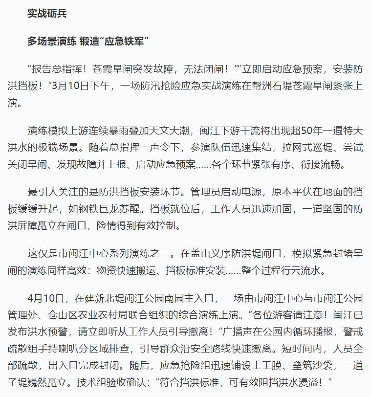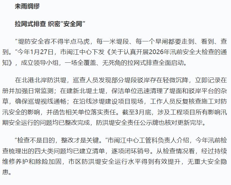 坚守一线护堤防 筑牢闽江安澜屏 ——福州市闽江下游河道管护中心抓实抓细2026年防汛备汛各项措施